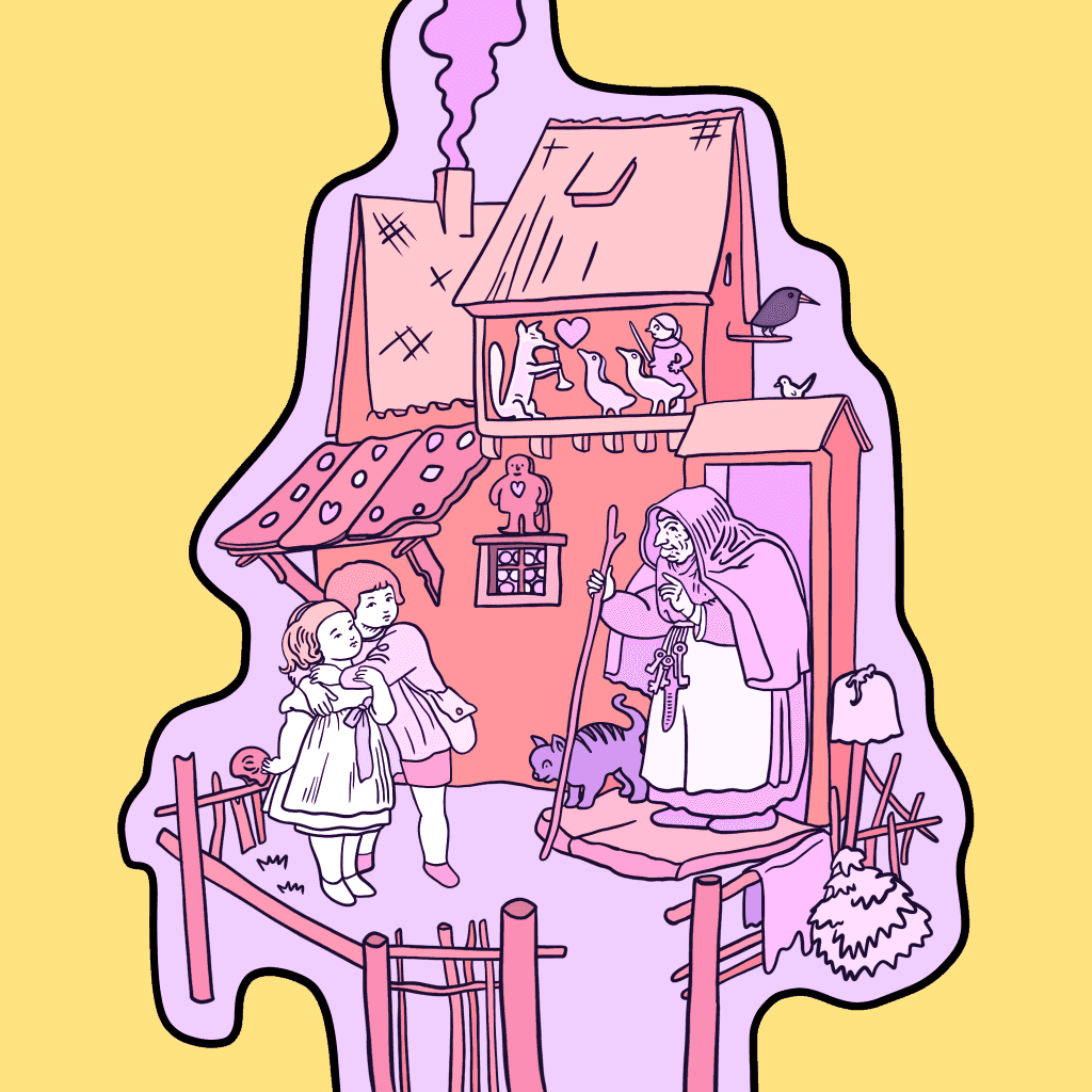 The tale of hungry siblings, a candy house, a hot oven, and finding the way home.